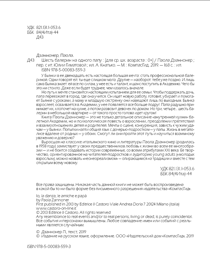 Книга Паолы Дзаннонер — это не только детальное описание «внутренней кухни» балетной Академии, но и психологическая повесть о взрослении, преодолении препятствий и взаимоотношениях детей и родителей. Мечты о сцене, конкуренция, зависть к чужим удачам — у Бьянки. Попытки найти общий язык с дочерью-подростком — у папы. Жизнь в мегаполисе вдалеке от родных — у обоих. Смогут ли они пройти этот путь и научиться взаимному уважению и доверию?