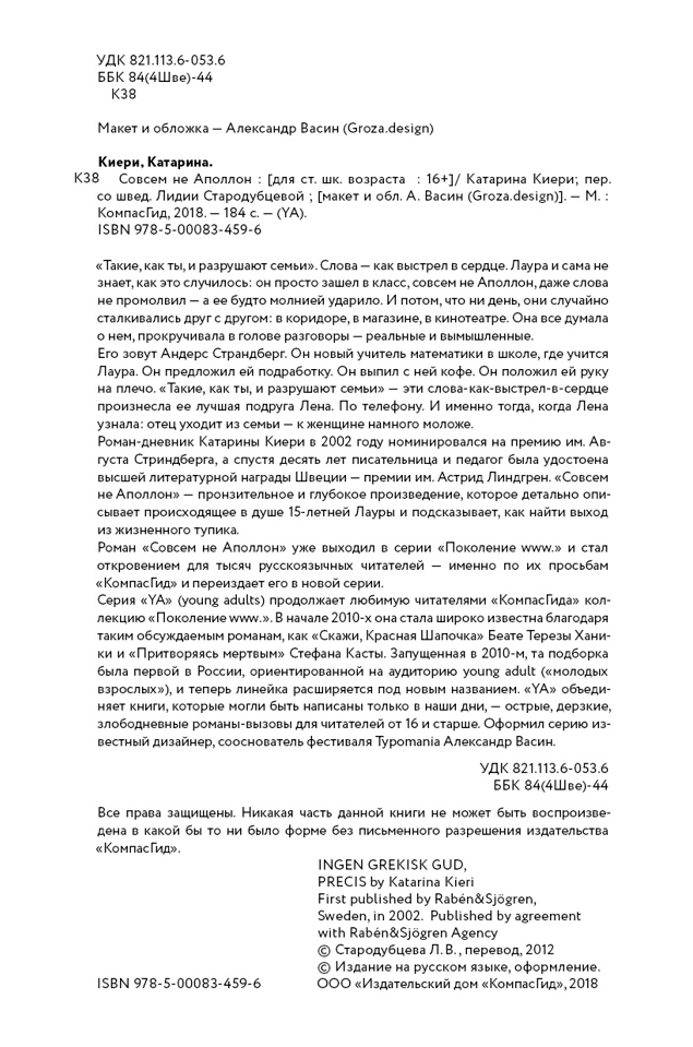 Роман-дневник Катарины Киери уже выходил в серии "Поколение www." и стал откровением для тысяч русскоязычных читателей - именно по их просьбам "КомпасГид" и переиздает его. В 2002 году он номинировался на премию им. Августа Стриндберга, а спустя десять лет писательница и педагог была удостоена высшей литературной награды Швеции - премии им. Астрид Линдгрен. В издательстве "КомпасГид" вышла на русском языке и другая повесть автора - "Никто не спит".