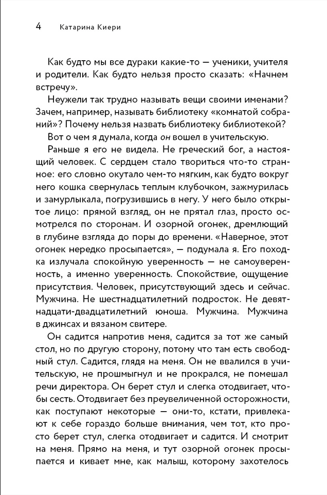 Катарина Киери дважды акцентирует внимание на том, как важно говорить друг с другом, какие проблемы появляются из-за неумения общаться. Более того: именно осмысление взаимоотношений с Леной, дружба как таковая находятся в центре повествования, а не влюбленность в учителя, как может показаться изначально. Получился эмоциональный и искренний текст-дневник, в котором есть оценка событий подростком — та сама категоричность суждений и максимализм, но при этом голос автора свободен от морали и назидательности. Стоит отметить изящность финала, в котором показана лучшая сторона первой любви — то, как бушующие чувства перенаправляются в желание творить.