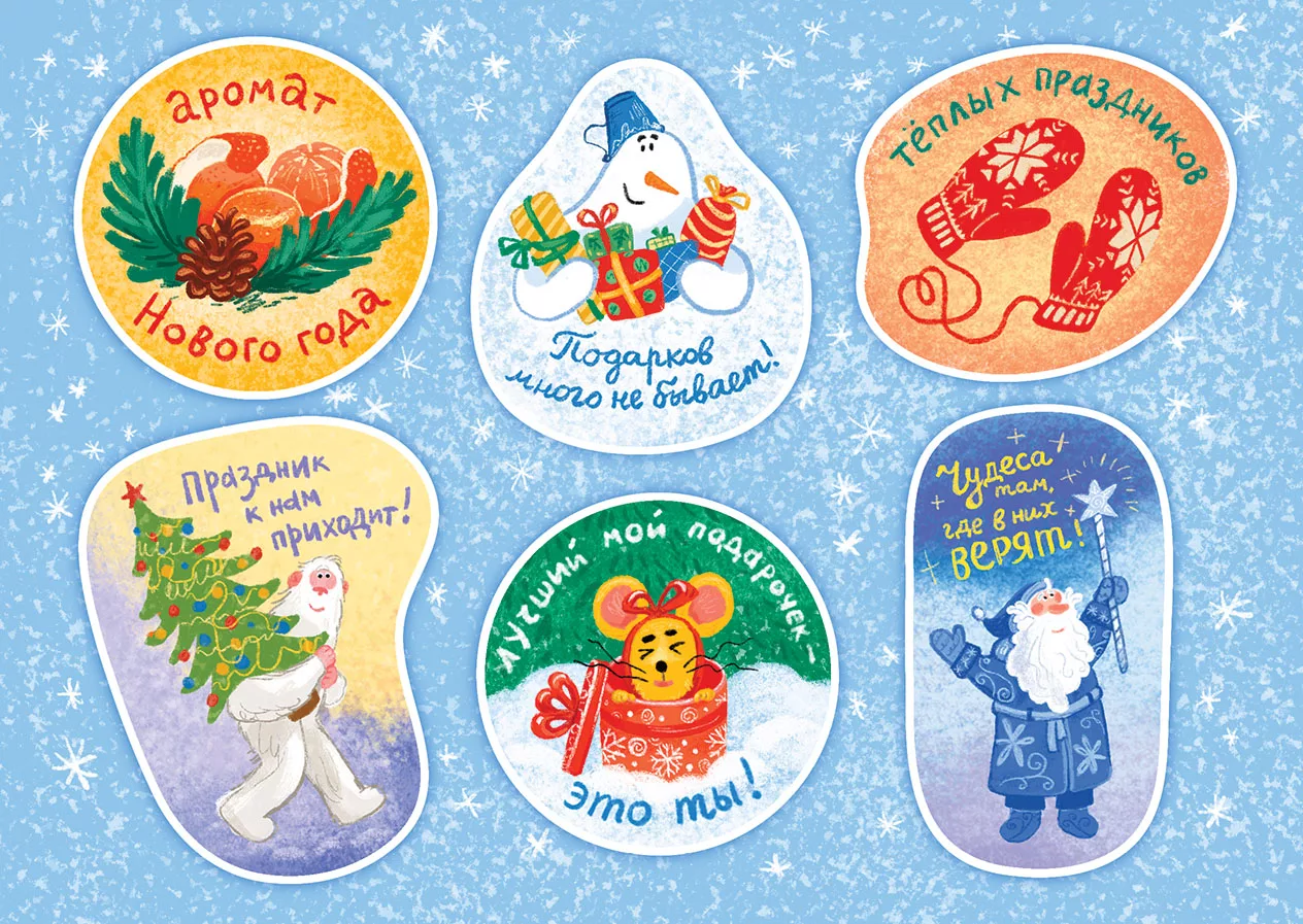 Стикеры к книге Александры Хворост "Подарок для Деда Мороза, или Похищение новогодней ёлки". Художница: Андрэа Коканович