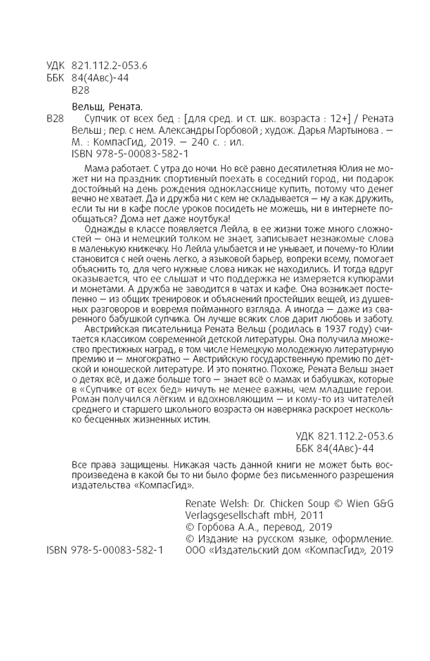 Австрийская писательница Рената Вельш (родилась в 1937 году) считается классиком современной детской литературы. Она получила множество престижных наград, в том числе Немецкую молодежную литературную премию и — многократно — Австрийскую государственную премию по детской и юношеской литературе. И это понятно. Похоже, Рената Вельш знает о детях всё, и даже больше того — знает всё о мамах и бабушках, которые в «Супчике от всех бед» ничуть не менее важны, чем младшие герои. Роман получился лёгким и вдохновляющим — и кому-то из читателей среднего и старшего школьного возраста он наверняка раскроет несколько бесценных жизненных истин.
