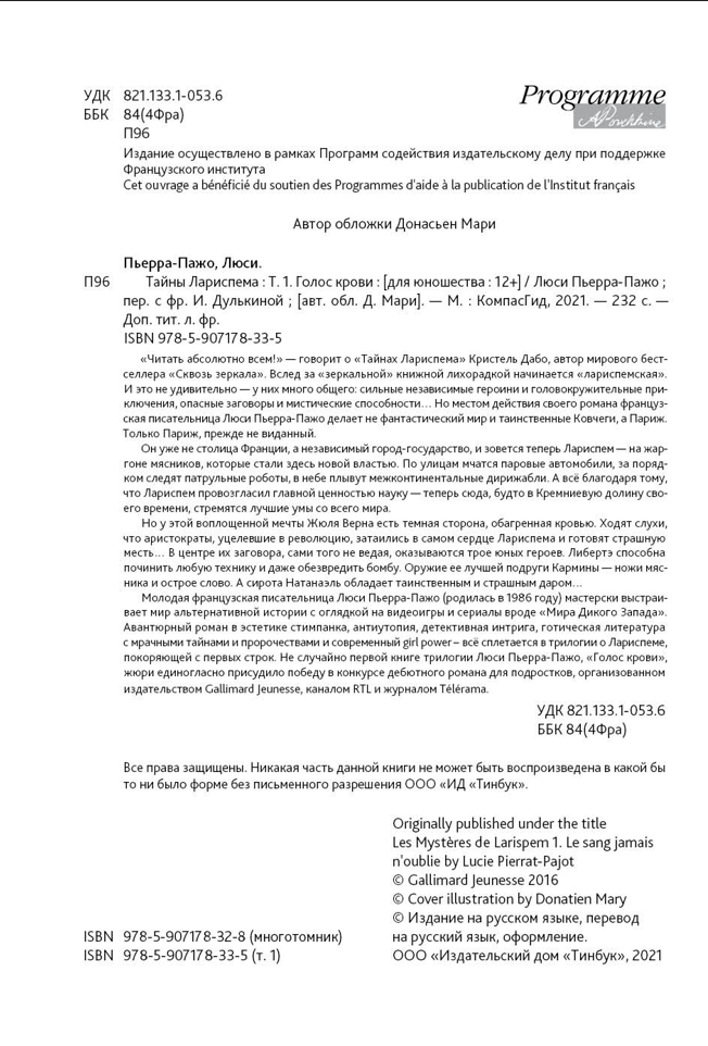 Молодая французская писательница Люси Пьерра-Пажо (родилась в 1986 году) мастерски выстраивает мир альтернативной истории с оглядкой на видеоигры и сериалы вроде "Мира Дикого Запада". Авантюрный роман в эстетике стимпанка, антиутопия, детективная интрига, готическая литература с мрачными тайнами и пророчествами и современный girl power - всё сплетается в трилогии о Лариспеме, покоряющей с первых строк. Не случайно первой книге серии, "Голос крови", жюри единогласно присудило победу в конкурсе дебютного романа для подростков, организованном издательством Gallimard Jeunesse, каналом RTL и журналом Telerama.