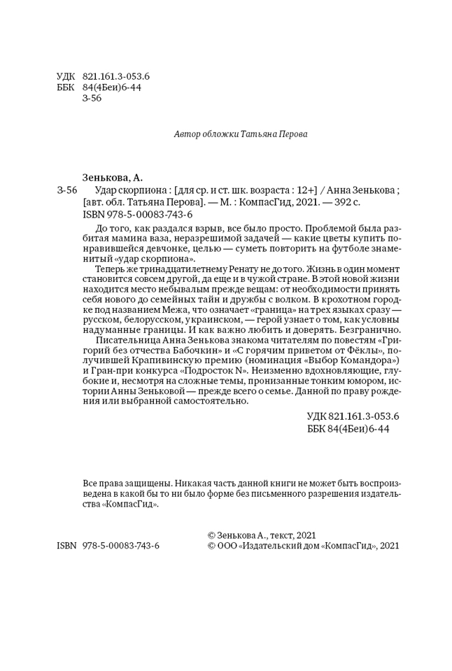 На обложке этой книги вы увидите футбольный мяч. Да и название футбольное: ударом скорпиона называется элемент в этой игре, во время которого мяч отбивают пятками в прыжке. Прием сложный, очень трудоемкий, и главный герой Ренат всегда хотел попробовать его исполнить. Но в целом история не про футбол. Судьба приготовила подростку другое испытание, с которым ему нужно постараться справиться.
