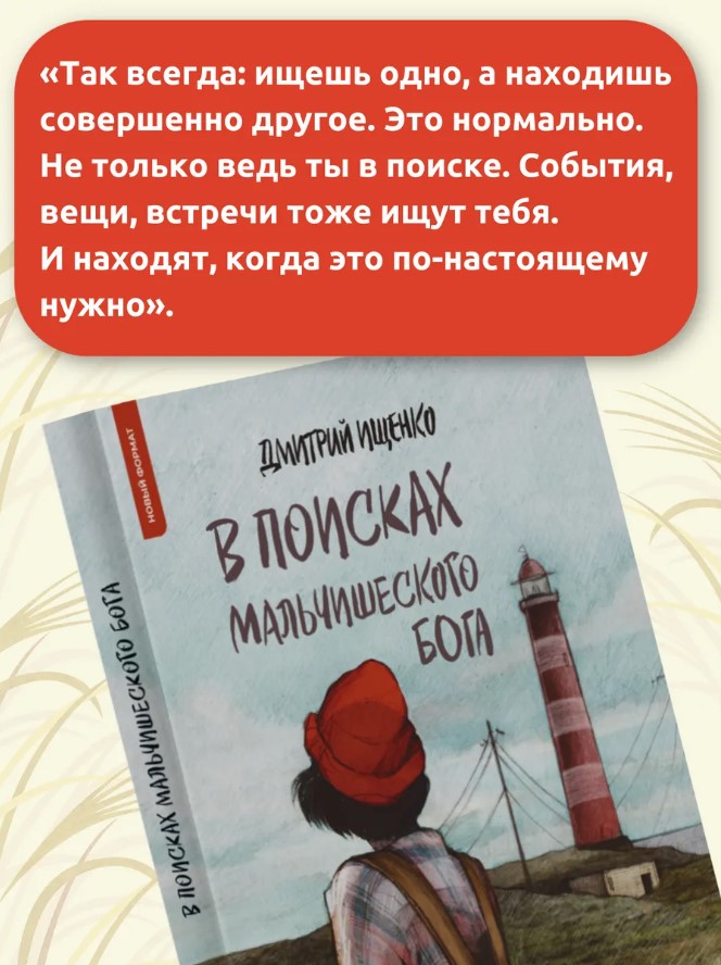 По страницам этой книги рассыпаны многочисленные подсказки, где и как искать своего мальчишеского бога, каким он может быть, как не потерять связи с ним. Повесть Дмитрия Ищенко — конечно, не коллекция практических советов для потерянных подростков, а скорее вдохновляющая и поразительно кинематографичная история о неизбежном окончании детства. Три месяца на живописном побережье Баренцева моря становятся для главного героя неиссякаемым источником опыта — и знания о самом себе.