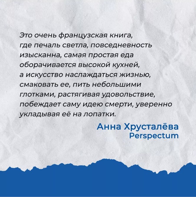 Это очень французская книга, где печаль светла, повседневность изысканна, самая простая еда оборачивается высокой кухней, а искусство наслаждаться жизнью, смаковать ее, пить небольшими глотками, растягивая удовольствие, побеждает саму идею смерти, уверенно укладывая ее на лопатки.