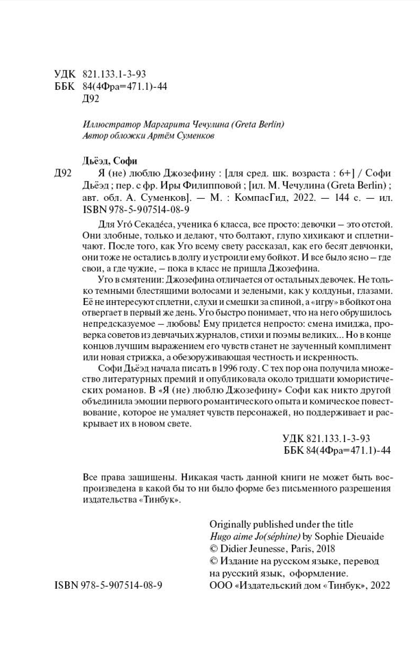Эта книга, которая поможет всем влюбленным посмотреть на себя со стороны, посмеяться над собой, понять, что большинство проблем мы создаем себе сами, а на самом деле все намного проще, чем кажется на первый взгляд. И, конечно, прочитав историю любви Уго и Джозефины, все влюбленные получат шанс прийти к взаимопониманию, ведь в этой книге можно найти много важных и действенных советов по выстраиванию отношений. И это без шуток! Очень рекомендую для чтения школьникам лет с 8-9, а также подросткам и их родителям, которые еще не забыли свою первую любовь.