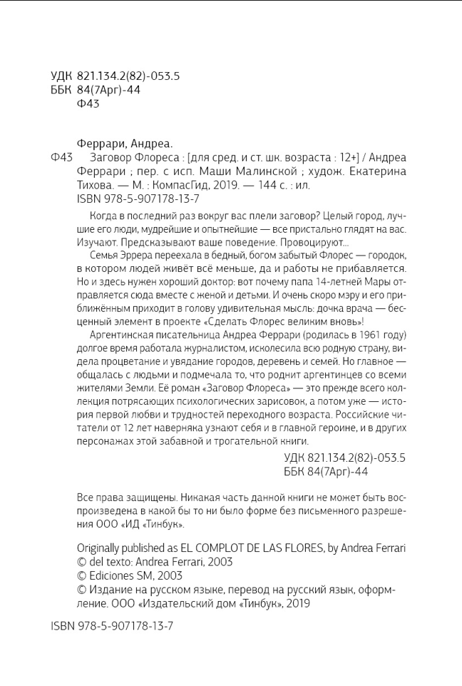 Аргентинская писательница Андреа Феррари (родилась в 1961 году) долгое время работала журналистом, исколесила всю родную страну, видела процветание и увядание городов, деревень и семей. Но главное - общалась с людьми и подмечала то, что роднит аргентинцев со всеми жителями Земли. Её роман "Заговор Флореса" - это прежде всего коллекция потрясающих психологических зарисовок, а потом уже - история первой любви и трудностей переходного возраста. Российские читатели от 12 лет наверняка узнают себя и в главной героине, и в других персонажах этой забавной и трогательной книги.